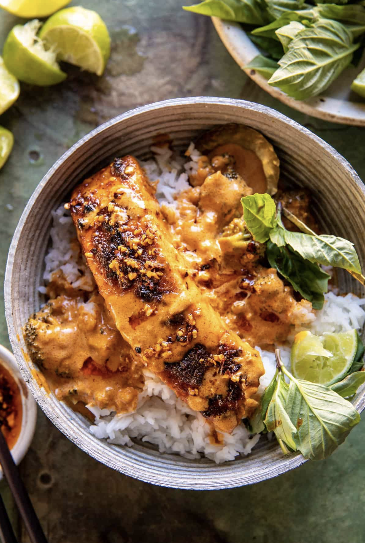 Serve the salmon and sauce over bowls of rice. Drizzle the butter over the salmon and top with basil or cilantro.